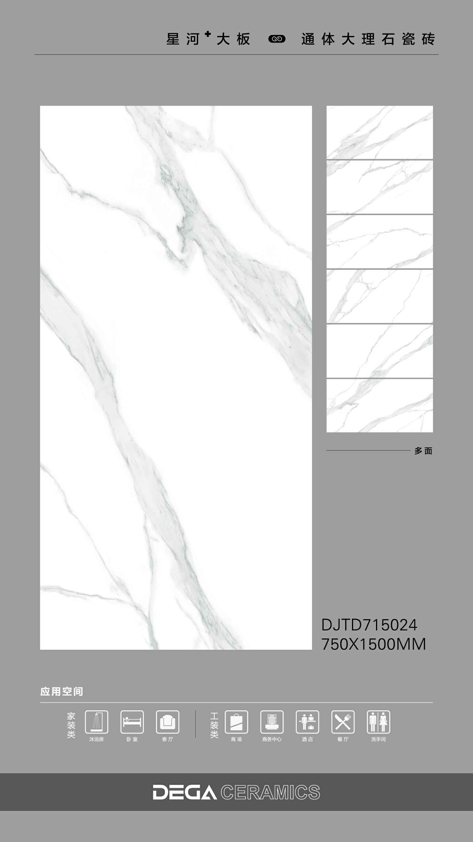 从规格形式的选择、纹理的趣味,到丰富内涵的表现、文化的传承等…… 都是她的每一侧面,在750X1500MM创造的舞台中央,是属于一片瓷砖传奇剧的演出。
